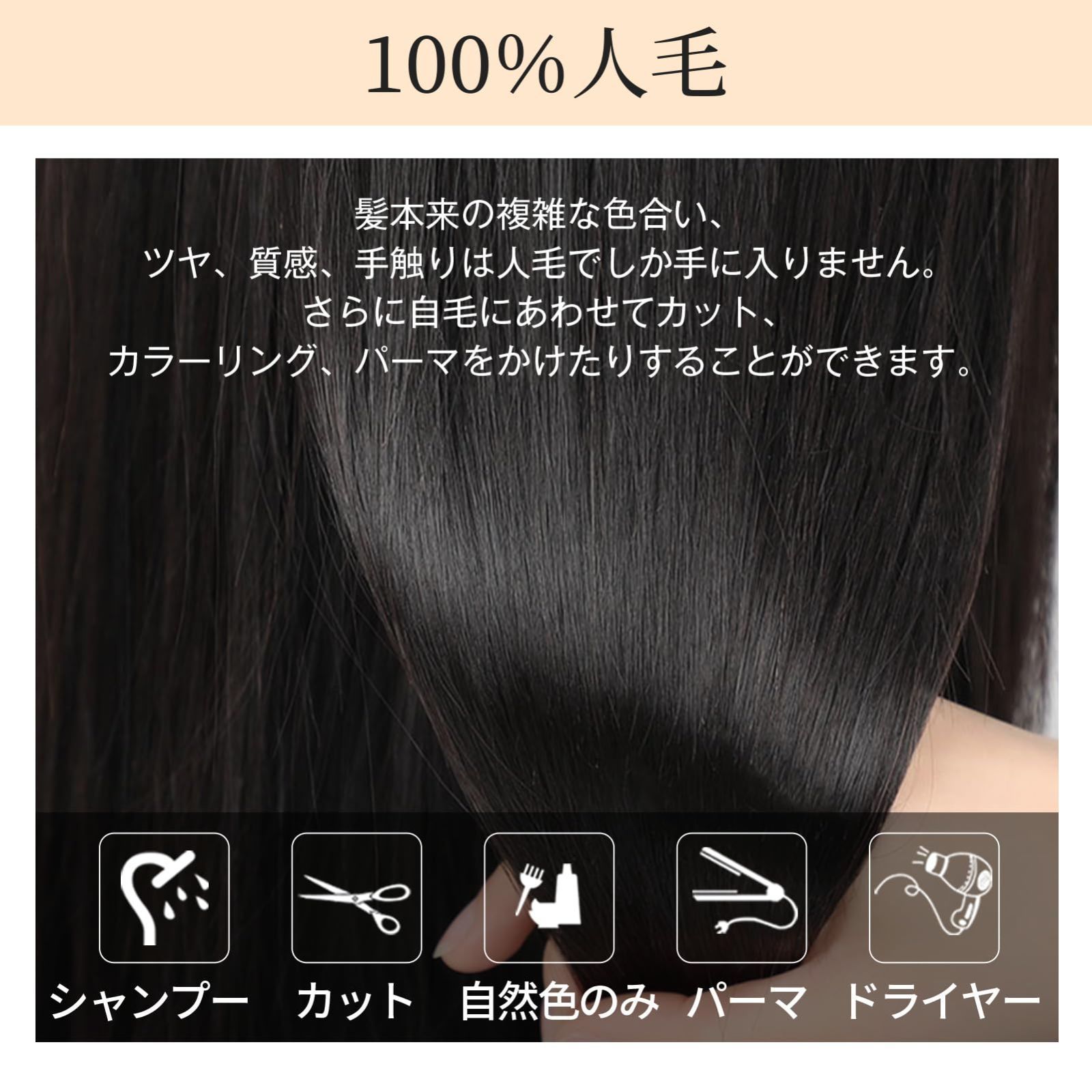 人毛100%:人毛100%の部分ウィッグは、自毛との馴染みが良く、テカリや質感が非常に自然です。人毛ならではの触感や動き、光の反射が、化学繊維製ウィッグとは異なり、よりリアルで本物らしい印象を与えます。
