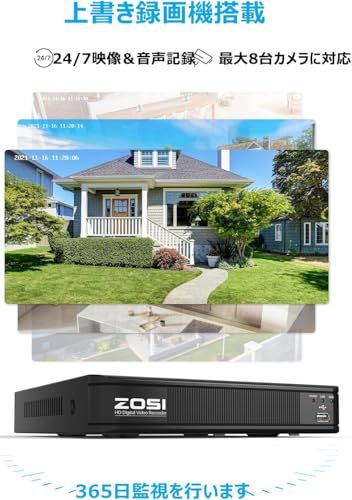 ZOSI 200万画素防犯カメラシステム 8 CH H 265 5 MPレコーダー 監視カメラ2台 AI人体車両検出 Eメールアラート ナイトビジョン IP 66 防水 HDDなし 55 bfcd 69