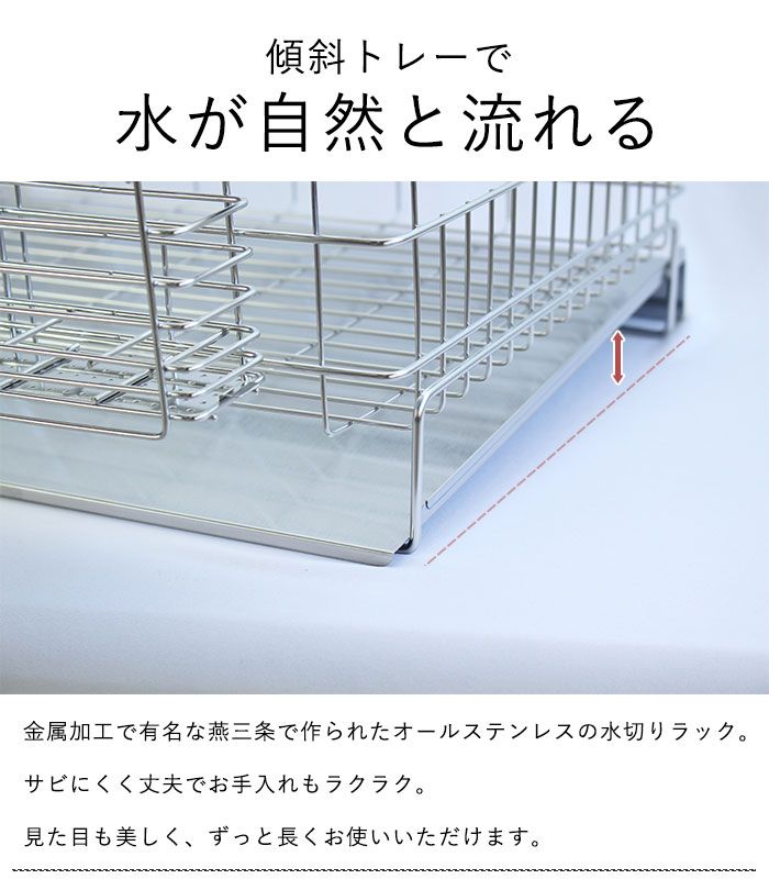 斜めトレー構造で水が自然に流れ、清潔に保てる水切りラックです。オールステンレス製なのでサビに強く、耐久性も抜群。トレーに水が溜まらずシンクへ直接流れるため、カビやぬめりの発生を抑えられます。箸立てやグラスホルダー付きで、食器やカトラリーを効率的に乾燥。シンプルでスタイリッシュなデザインは、キッチンを清潔でおしゃれに演出します。安心の日本製(燕三条)で長くご愛用いただけます。