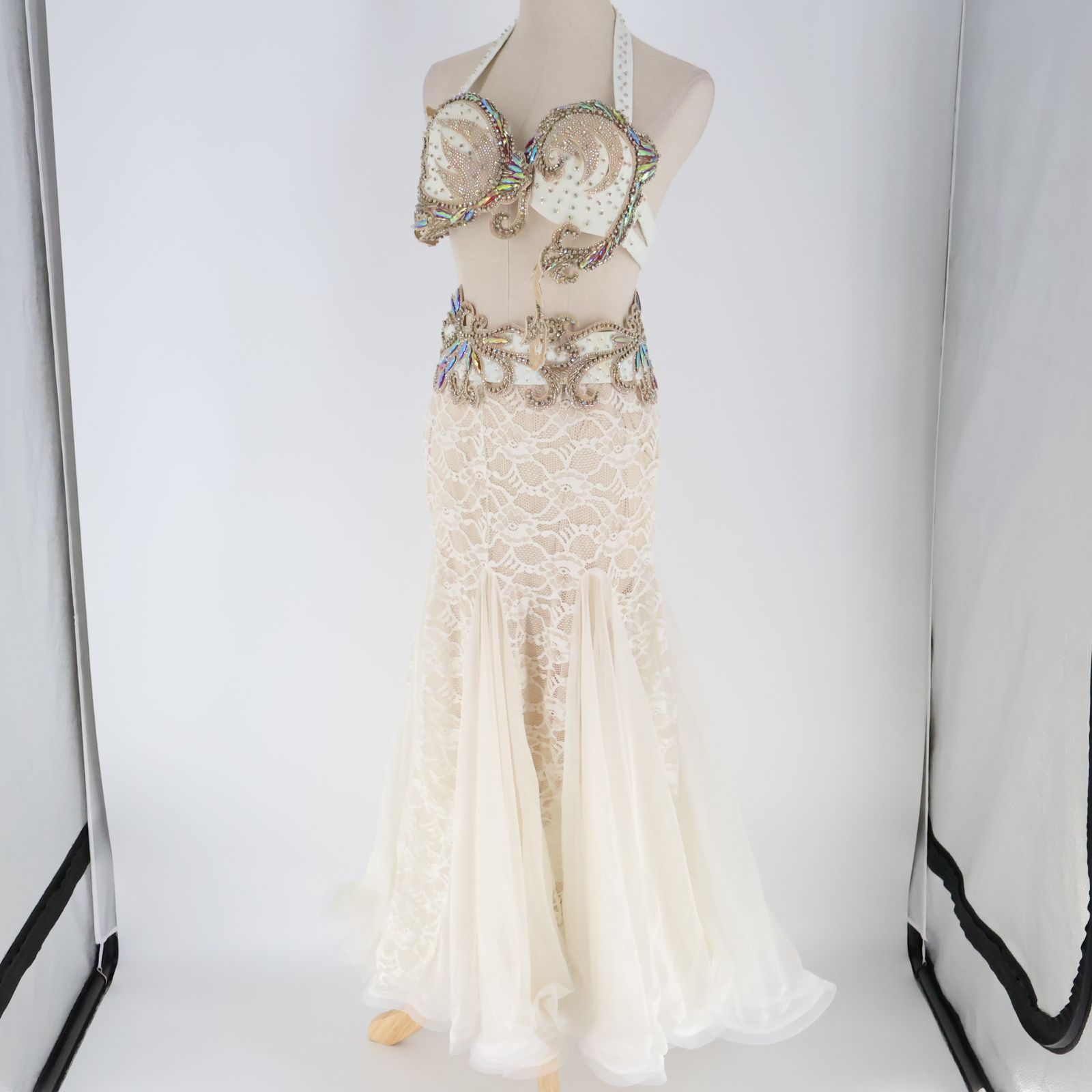 ベリーダンス用 オリエンタル衣装 ホワイト×ベージュ ラインストーン ビーズ 豪華 クリーム色 白 フリル レース 華やか 大きく広がる裾 ブラトップ ベルト スカートセット 花のコスチューム付き 女性らしい