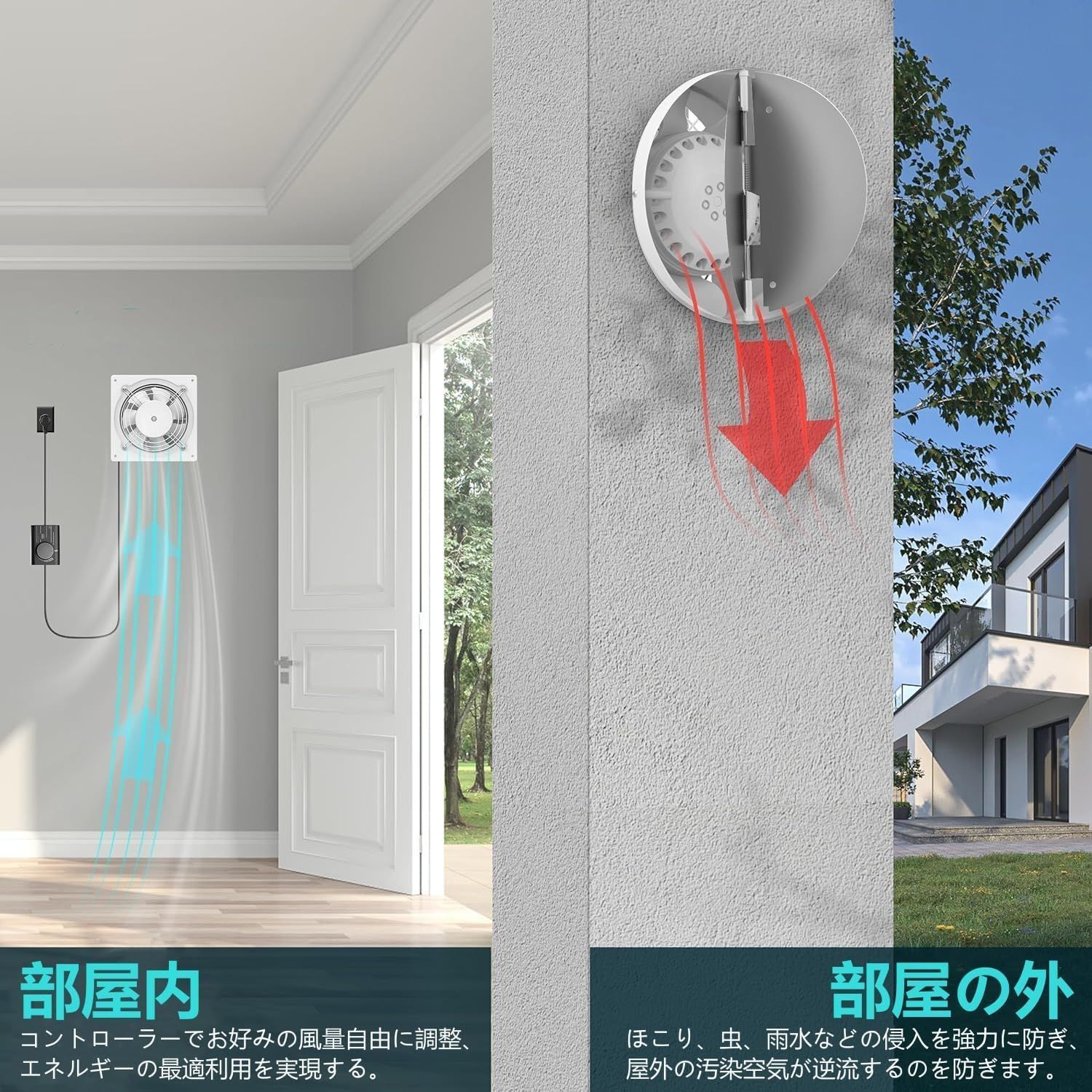 【高密度防護網&汚染空気の逆流防止】換気扇の前には高密度な金属防護網を採用され、羽根の高速運転中に異物が巻き込まれるのを防ぐだけでなく、身体接触による怪我も防ぎます。後ろ側は逆風防止ダンパーが付き、ほこり、虫、綿、雨水などの侵入を強力に防ぎ、屋外の汚染空気が逆流するのを防ぎます。部屋換気用換気扇、倉庫用換気扇、キャンピングカー用換気扇、床下換気扇、キッチン換気扇、トイレ排気扇、天井換気扇としては最適です。(天井に取り付ける場合は、まず逆風防止ダンパーを取り外してください)