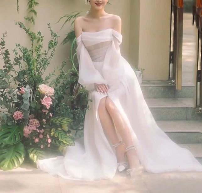 ボリューム袖 ウェディングドレス 長袖 オフショル Aライン 韓国