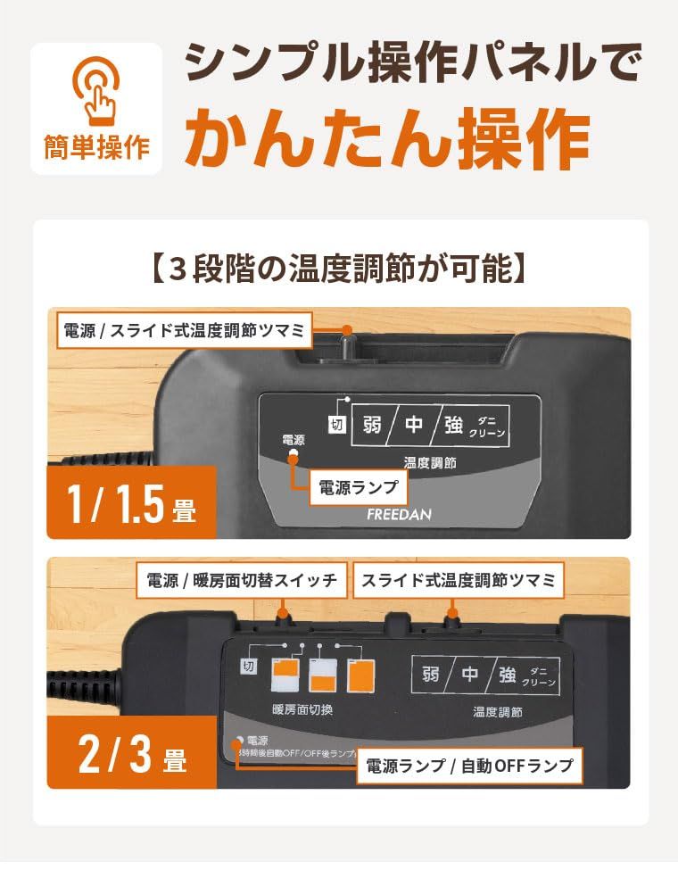 スライド式のシンプルなコントローラーパネルとなっております。温度調整も無段階のスライド式となっておりますので、お好みの温度で使用可能です。
