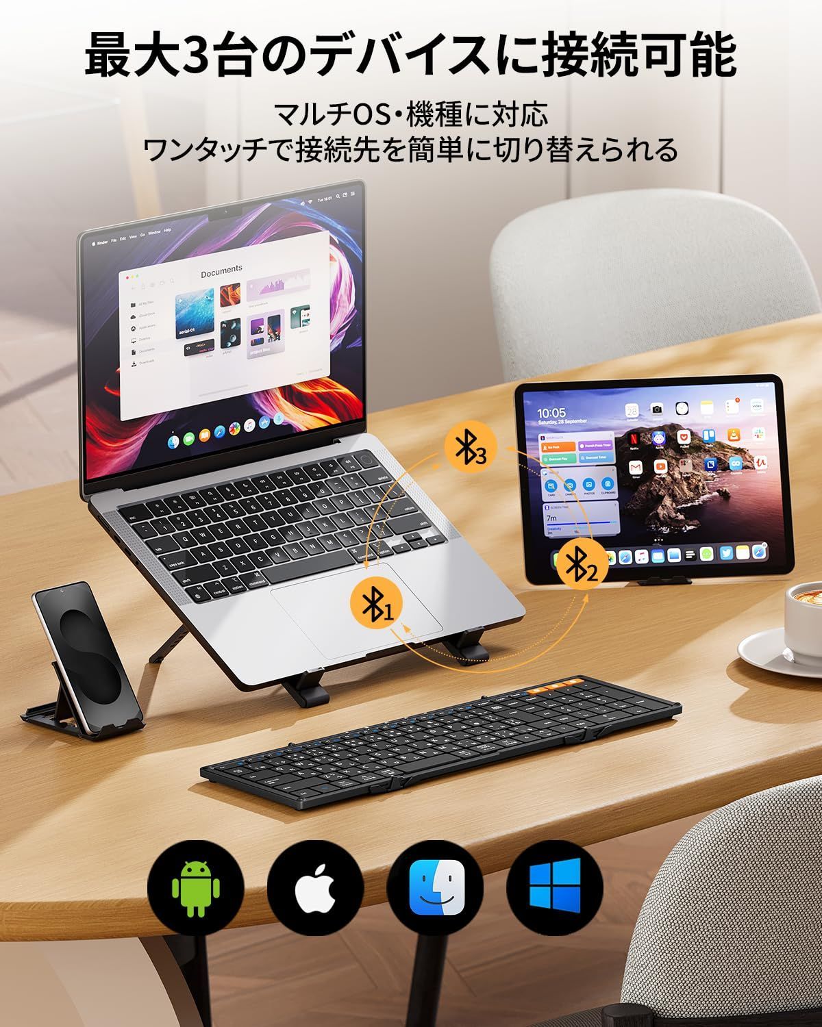 【最大3台同時接続&マルチOS対応】このBluetoothキーボードはiPadOS、iOS、Android、Mac、Windowsなど幅広いOSに対応しており、、最大3台までのデバイスとペアリングが可能です。ボタン一つで接続先を簡単に切り替えられるため、PC、タブレット、スマートフォンなど複数の端末を使い分けている方に非常に便利です。