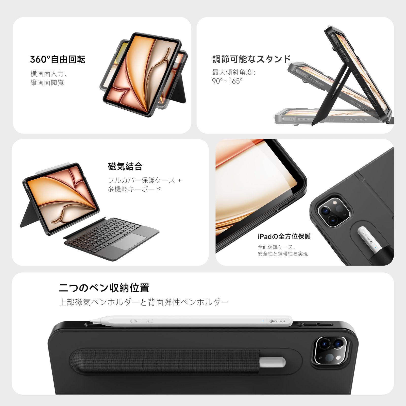 磁気式着脱デザイン: HOU iPad Air/Pro 11 インチ 用回転キーボードケースは、磁気技術により1 秒で取り付け / 取り外しが可能です。モバイルシーンに最適化:ケースのみで描画や読書に使用し、キーボードと組み合わせればオフィスワークや学習など、多様なニーズに対応します。