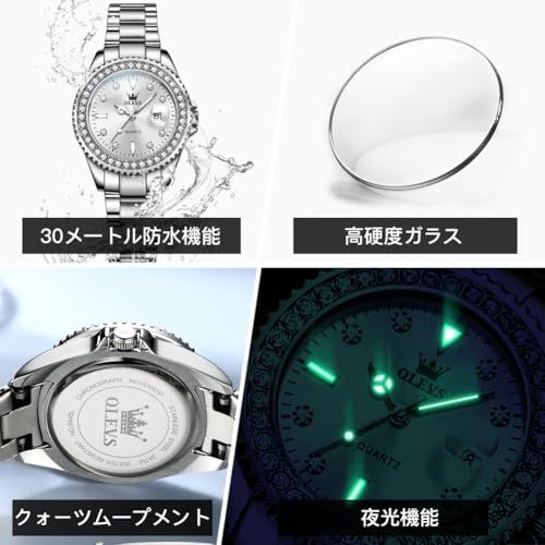 OLEVS女性腕時計:高級感溢れるデザインで、ダイヤモンド文字盤がエレガントなスタイルを呈しています。時計は夜光機能を備えているため、夜でも時間を確認できます。