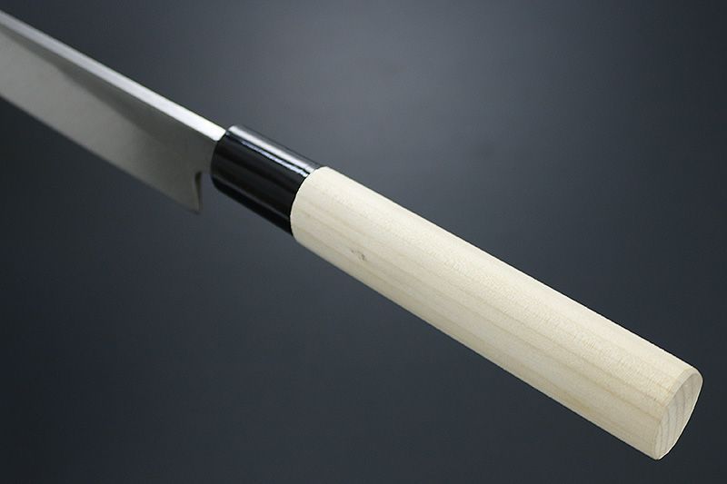 日本料理の繊細さを表現する本格的な刺身包丁。刺身の切り口は修行を積んだ板前さんの腕の見せどころですが、よく切れる柳刃包丁が必需品です。このシリーズの包丁は最高級の包丁ではありませんが、本格的なパフォーマンスが期待できる包丁です。天然木の朴の木の白っぽい美しい木肌と、磨き仕上げのブレードが素朴なテイスト。