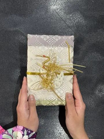 着物/帯から作られたご祝儀袋です水引もイメージに合わせて仕上げました