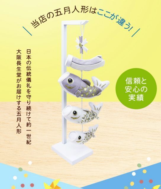 当店で扱う五月人形は最近の住宅事情を踏まえ、机の上に簡単に、コンパクトに飾れるような可愛い五月人形や鯉のぼりばかりです。