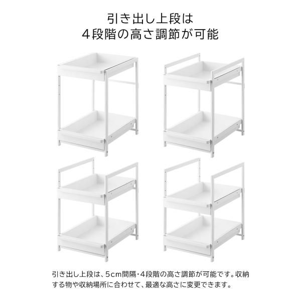 奥行と高さがあって収納が難しいシンク下を有効活用できるスライド式収納ラック2段。引き出しはハンドル付きで引き出しやすく、スライド式なので奥の収納物もスムーズに出し入れができます。引き出し上段は収納する物に合わせて、5cm刻みで高さが4段階調節できます。洗面台下への設置もおすすめです。