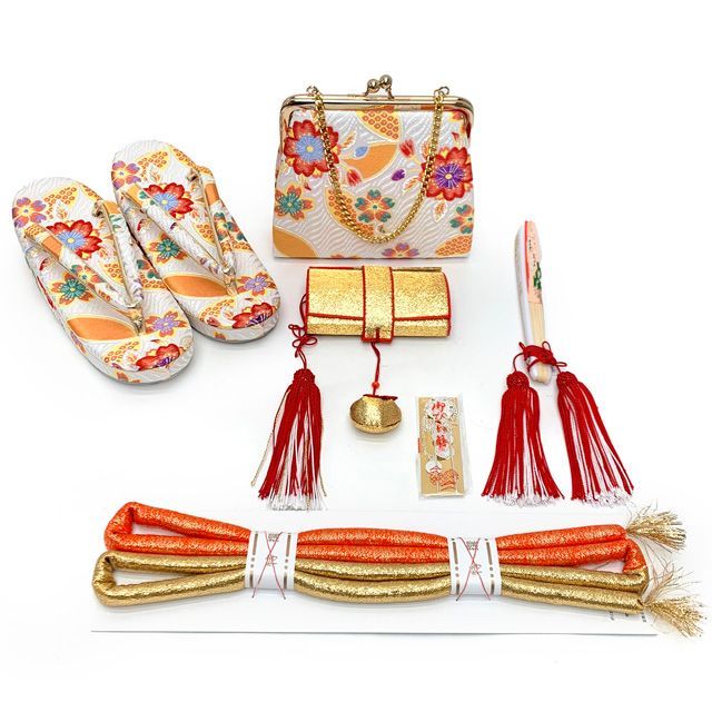 7歳女の子用の古典柄の四つ身の着物に、結び帯とはこせこ小物セット・しごきや帯揚げをコーディネートし、その他着付けに必要な小物まで揃えたフルセットでの販売です。