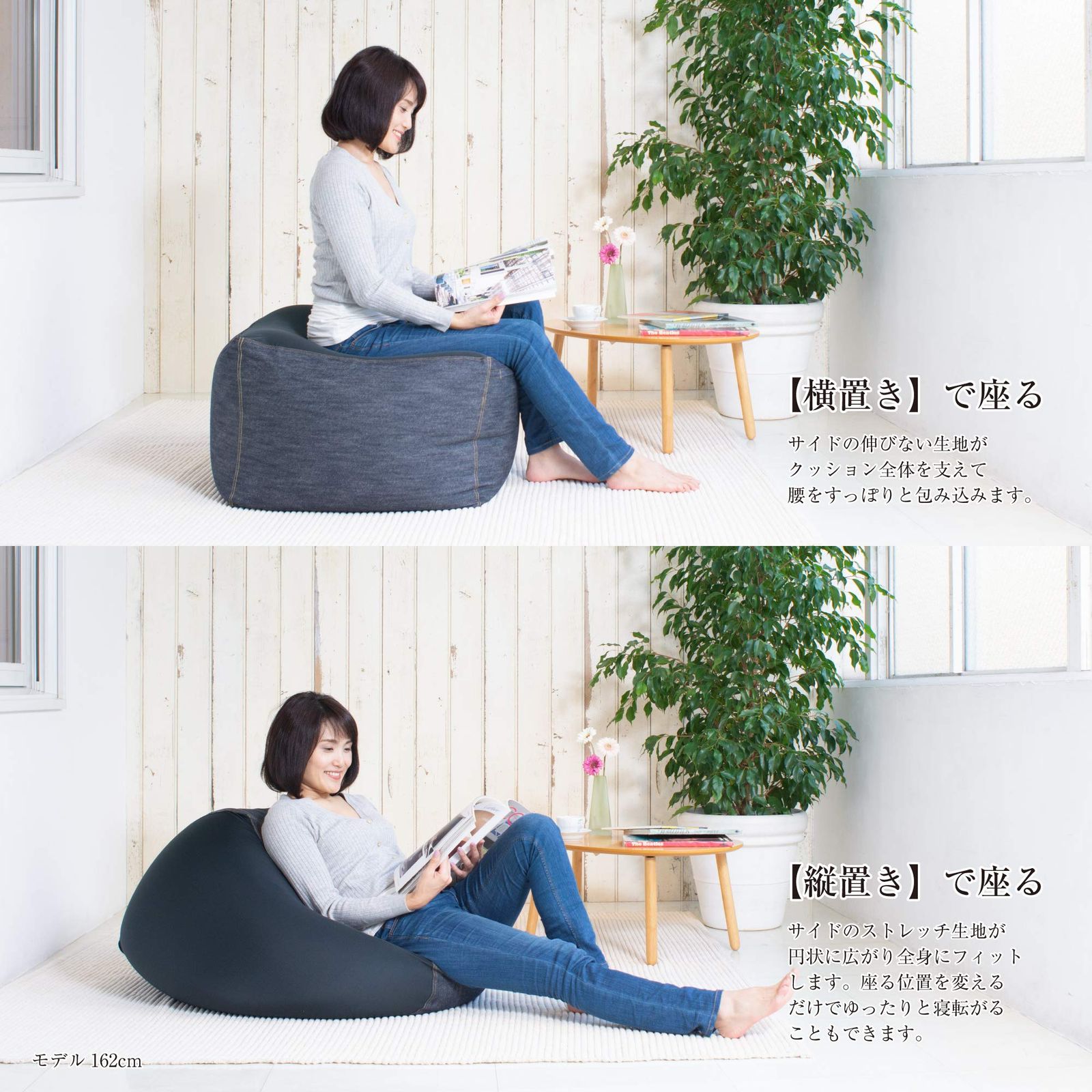 ●ゆったりと座る・伸びない生地面に座ると、体が吸い付くようにもちっと変形し、あなただけのソファになります。