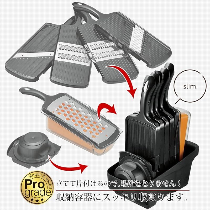 セット内容:厚み調整スライサー、千切り、細千切り、ワッフルスライサー、おろし器、ザル、容器、ホルダー