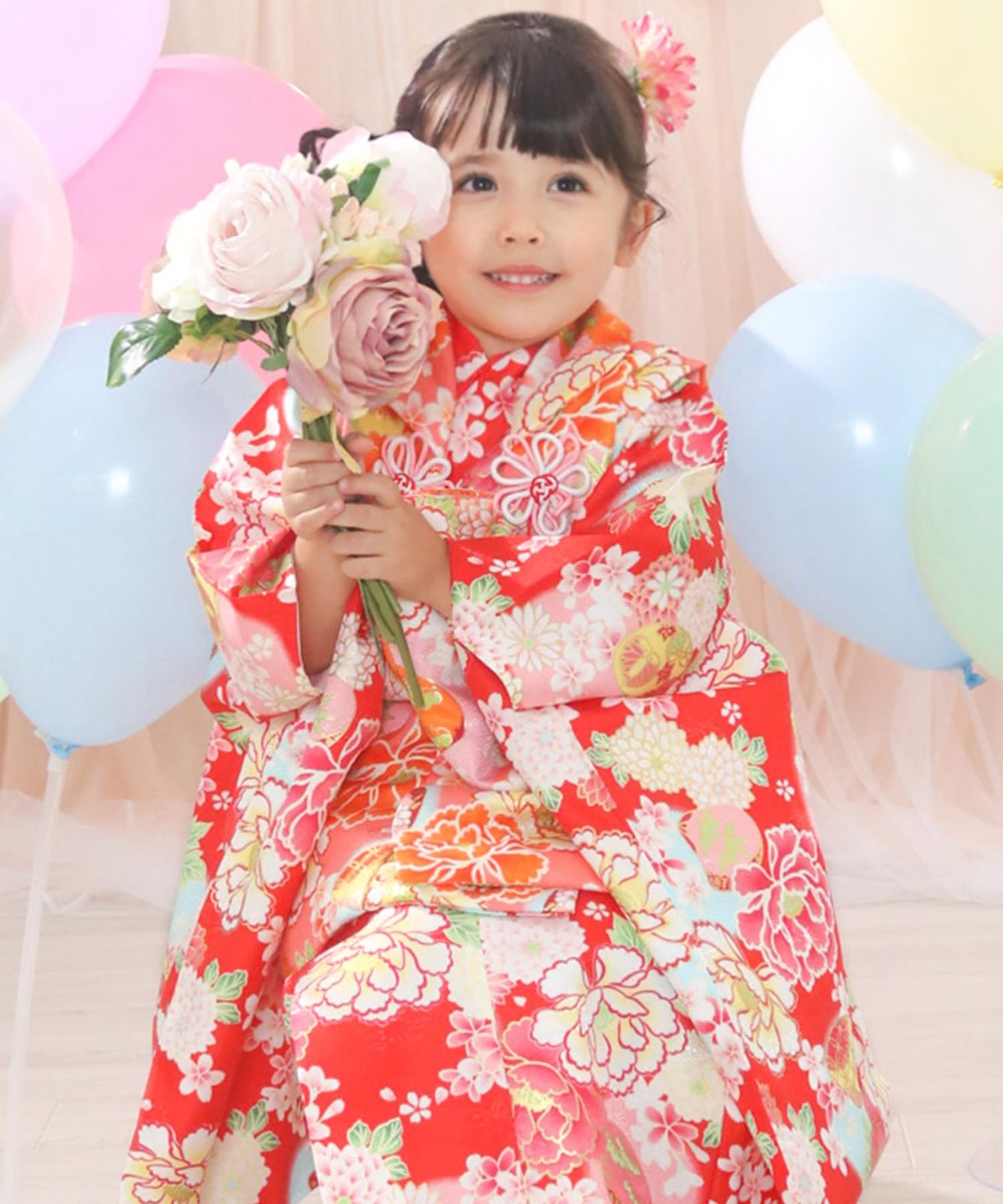 ・[セット内容]:被布/着物/伊達衿/長襦袢/髪飾り/巾着/草履/腰紐/足袋/専用化粧箱