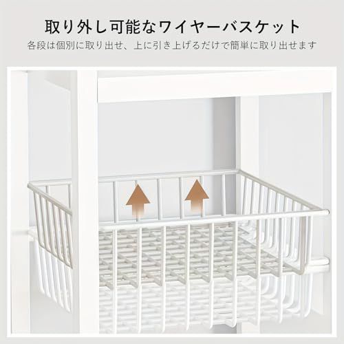 【便利なワイヤーバスケット付き】取り外し可能なワイヤーバスケットが3つ付属。野菜や果物、調味料、その他小物などを効率よく収納できます。通気性が良く、中身が見やすいため、キッチンだけでなく寝室やリビングでも活躍します。収納が難しいアイテムもすっきり整理できる便利なレンジラックです。