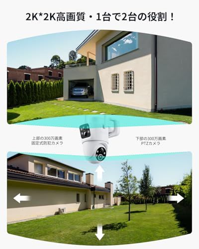 【デュアルレンズ防犯カメラ・真の360全方位カバー・1台で2台の役割】本防犯カメラ 屋外 ソーラーは デュアルレンズ設計により、2つの異なる角度から同時に画像を撮影するため、死角なし真の360全方位カバーを実現します。固定レンズとPTZ回転レンズを搭載して、カメラの視点を固定して広いエリアを24時間監視できます。従来の自動追尾型カメラは複数人を同時に追えない、他のエリアが監視から外れるの悩みを解決します。および水平350度・垂直90度回転機能も搭載。どこにいてもスマホで自宅の周りを隈なく見渡すことができます。カーポートにの愛車の状態を確認して、同時に玄関先の来訪者を確認することができます。