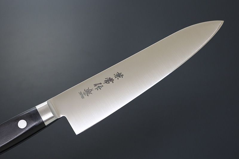 飾り気のないシンプルで機能的なデザインで、信頼できるパートナーとなる包丁です。最高品質モリブデン鋼AUS-10を採用し、錆びにくく鋭い切れ味を誇り、ブレード構造はAUS-10ステンレス鋼の単層鋼(全ステンレス)。中子形状は 本通し(ハンドル部全部=フルタング)で、口金は溶接されています。ハンドル材の黒合板は耐水性の丈夫な材質で、しっかりと三か所でカシメられ、ハードユースに耐えうる構造の業務用包丁です。牛刀180mmは、一般のご家庭においても大変使い勝手が良くスタイルで、三徳同様に人気があるモデルです。