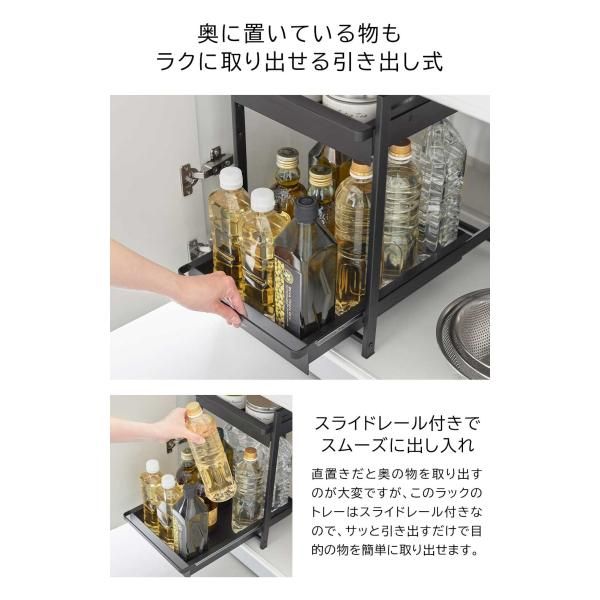 奥行と高さがあって収納が難しいシンク下を有効活用できるスライド式収納ラック2段。引き出しはハンドル付きで引き出しやすく、スライド式なので奥の収納物もスムーズに出し入れができます。引き出し上段は収納する物に合わせて、5cm刻みで高さが4段階調節できます。洗面台下への設置もおすすめです。