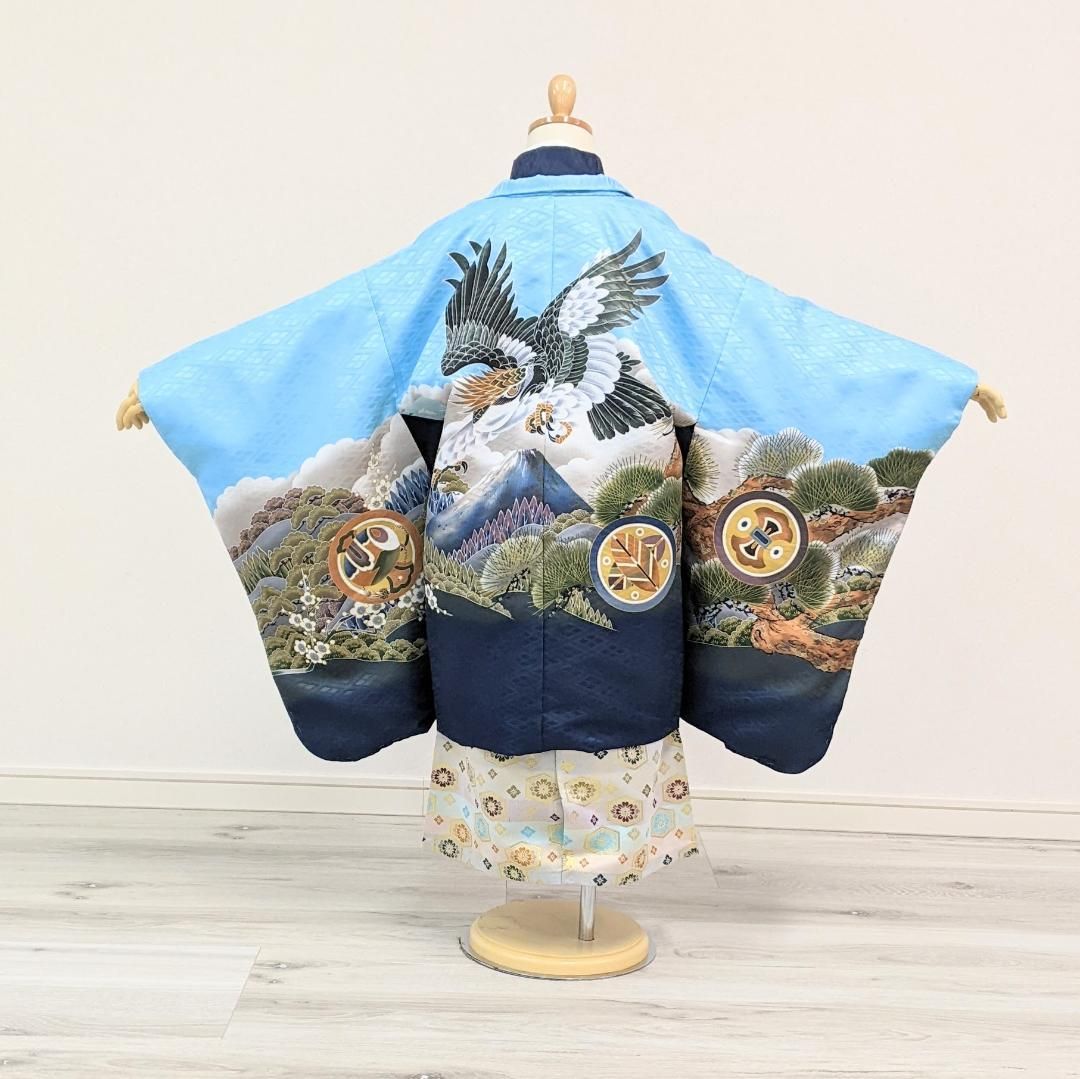 七五三 5歳 男の子 男児 着物 羽織 袴 セット 青 水色 鷹 A 7 8