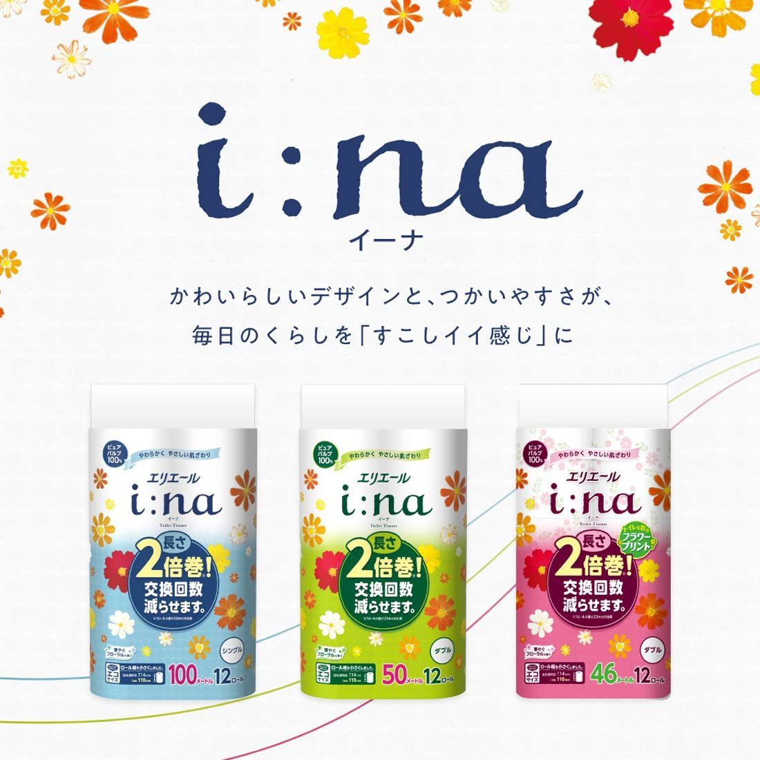 エリエール トイレットペーパー i:na(イーナ) 2倍巻き 100m×72ロール(18ロール x 4パック) シングル パルプ100% 華やぐフローラルの香り【ケース販売】