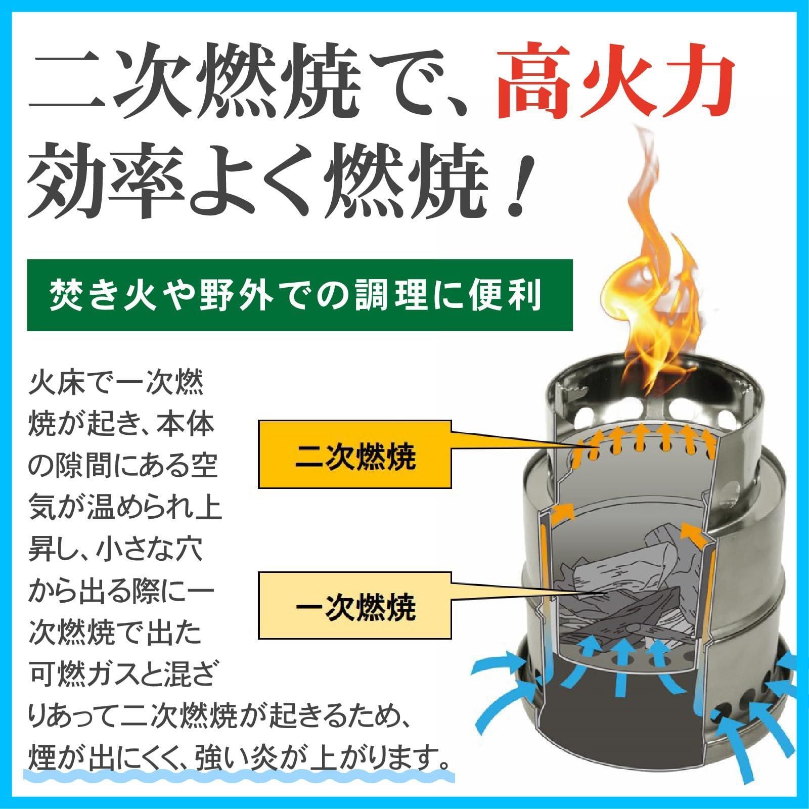 【二次燃焼で効率良く燃焼】高火力、二次燃焼効率の良いアウトドアストーブです。小枝などの自然燃料で火おこしが可能です。