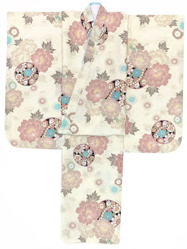 七五三 7歳 女の子用 小紋柄 四つ身の着物と結び帯 他 フルセット クリーム系 古典柄 鞠と牡丹 T 7 K 2555 i
