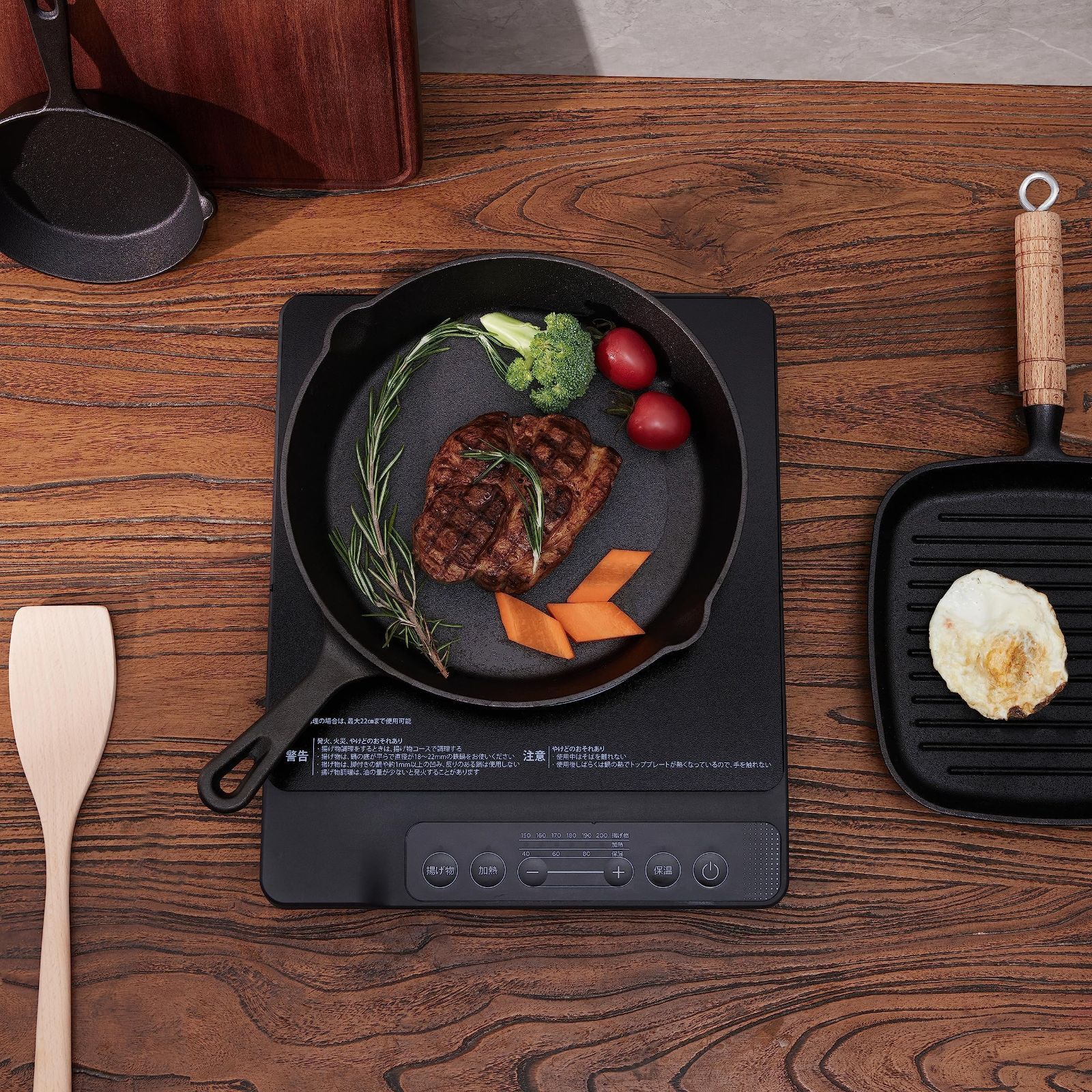 最大1400Wの高火力で炒め物・揚げ物・鍋料理・蒸し料理など、様々なレパートリーが楽しめる。火力・温度共に6段階で調節が可能(火力:300W~1400W、温度:150~200°C)。3段階に温度調節が可能な保温機能付き (40/60/80°C)