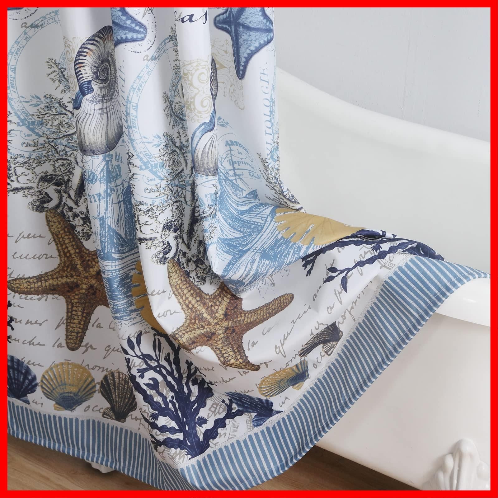 海をテーマにしたストライプの縁の入浴カーテンで、あなたの海辺のリゾートの家をれてこのシンプルなプリントはのヒトデサンゴと帆船の灯台とはがきの背景の美しい色とみ合わせることができます