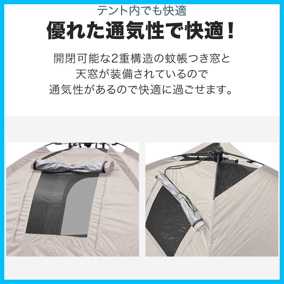 ?【優れた通気性でテント内も快適!】 ジッパーで開閉可能な2重構造の蚊帳つき窓と大きな天窓が装備されているので通気性に優れ、テント内でも快適に過ごすことができます。また、テントを支えるポールは丈夫なグラスファイバー製を採用しています。