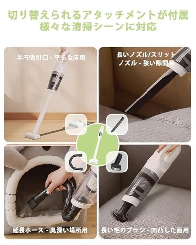 【2WAYスティッククリーナー・充実のアタッチメントセット】使い勝手の良さを追求した2WAY掃除機です。延長パイプを簡単に外すだけで、ハンディタイプに変身。狭い隙間や高い場所の掃除もらくらくに行え、車内や家具の細かい部分までしっかりアプローチします。付属の多彩なノズルで、床から天井まで、あらゆるシーンに対応可能。さらに、軽量設計により力のかからない操作が実現し、女性やご年配の方も負担なくお使いいただけます。日常のお掃除からアウトドア活用まで、快適なクリーニングをサポートします。