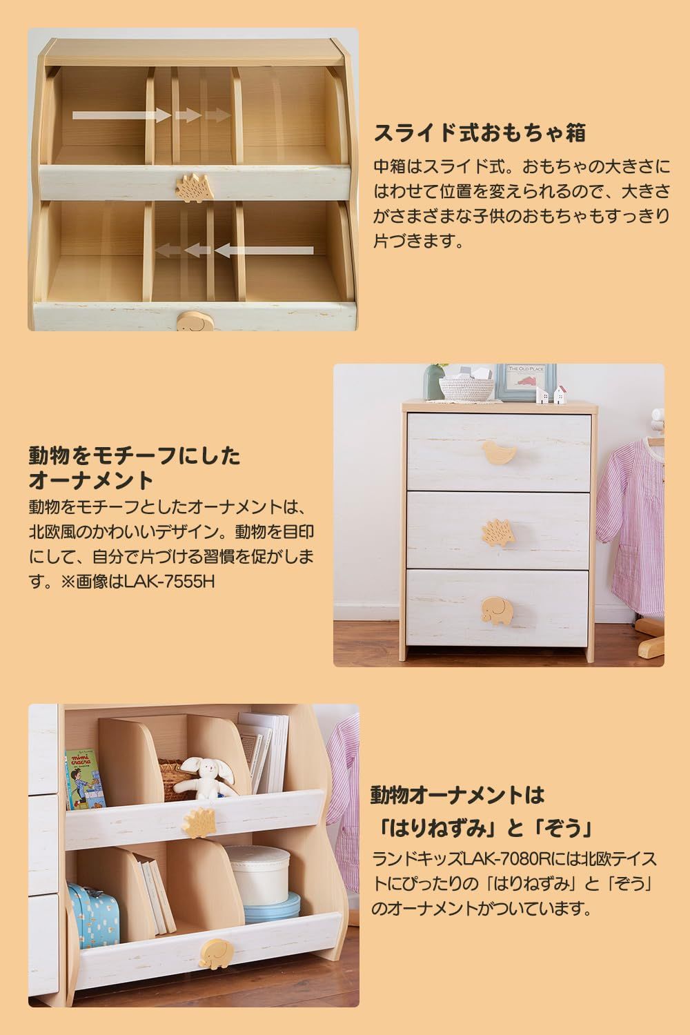 仕切り板がスライドして、形が不揃いな子供のおもちゃや絵本を収納するLAK-7080R。