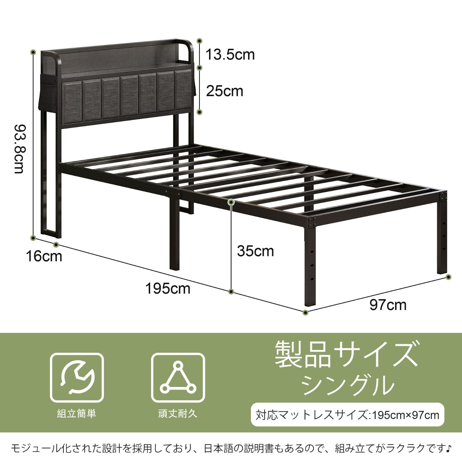 【便利なベッドフレーム】このヘッドボード付きのメタルシングルベッドフレームには収納棚と小さなポケットを備えており、本、眼鏡、ランプなどを棚に置くことができ、いつでも取りやすい。これで寝室内をすっきりさせることもできます。