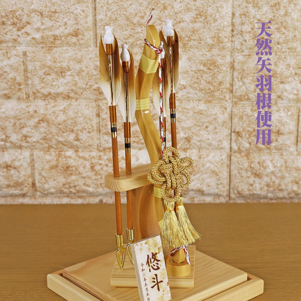 無垢材を使用し、木目を生かした破魔弓飾りです。
