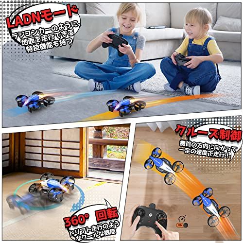 【陸・空両用】2つの操作モード、2つの遊び方、陸・空両用ドローンがもっと楽しくなります!子どもへの面白いプレゼントに最適です。FLIGHTモードでは、本製品がドローンのように空を飛び、LANDモードでは、リモコンカーのように地上を走ります。