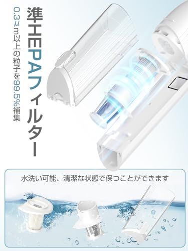 【多層濾過お手入れ簡単ライト付き】掃除機は99.5%のホコリを効果的に除去し、さらに0.3マイクロメートル以下の粒子を除去し、よりさわやかな空気を呼吸させます。また、フィルターやヘッドブラシは水洗いが可能なので、コードレスクリーナーを清潔に使えます。HEPAフィルターが2つ入ってるので、洗って乾くまで待たなくてもすぐにご利用できます。また、ライト付き、ほこり