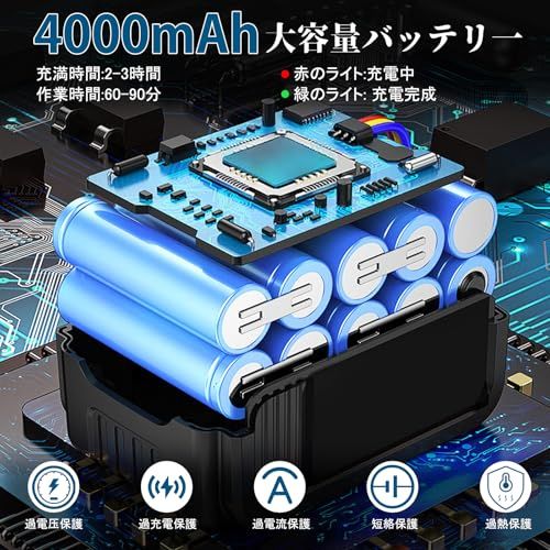 【PSE認証済み21V/4000mAh大容量バッテリー2本同梱】一度の充電で約60分もの長時間作業を実現。さらに、約3時間での急速充電機能により、大規模な庭木の手入れから伐採作業まで、バッテリー切れによる中断のない、スムーズで効率的な作業フローを約束します。キタ18V/21Vバッテリーとの互換性で、軽量設計と相まって、長時間の作業を快適に支えます。さらに、過電流・過充電・過熱など多重的な保護回路を内蔵し、充電時や保管時も安心です。ご注意:バッテリー寿命を最大限に延ばすため、使用前には必ず満充電状態にしてからご使用ください。