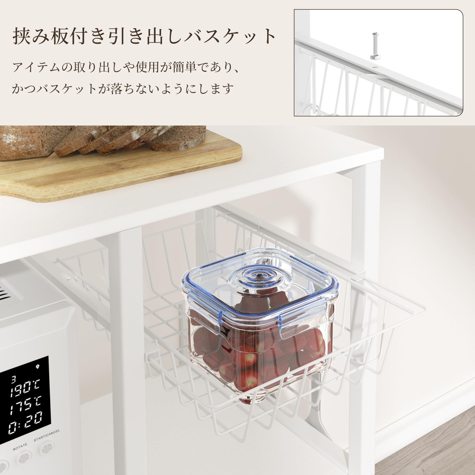 【多機能収納ラック】レールで棚板をスライドできます。引出の構造について通気性がいいワイヤーバスケットなので、落としやすい小物が収納できます。レンジ台やプリント台を置くときにも使いやすい。上の棚板は調味料入れや調理器具などを落下防止構造なので、安心しながらまとめて収納できます。