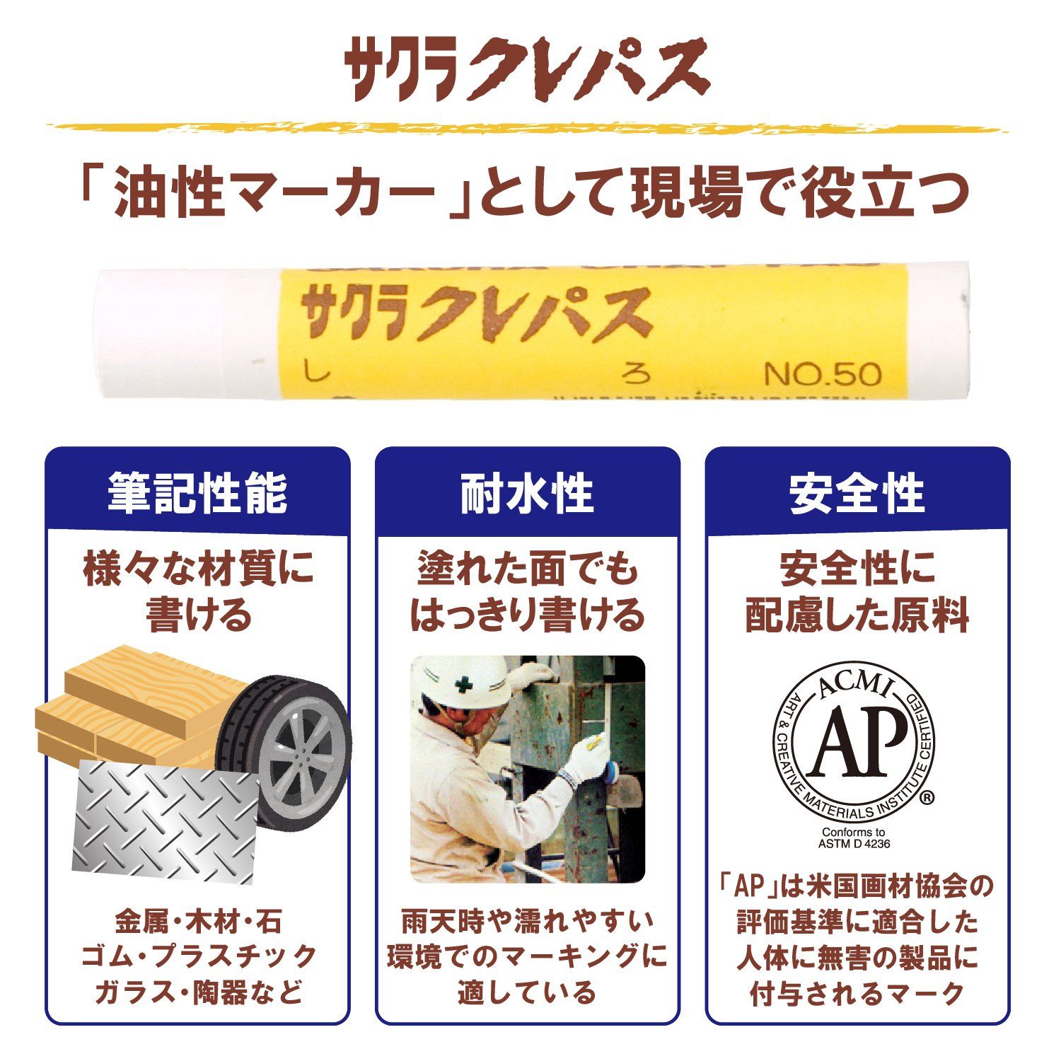子どもから専門家まで愛され続ける「クレパス」は、油性マーカーとして、木材、金属、プラスチック、ゴムへのマーキングも可能。