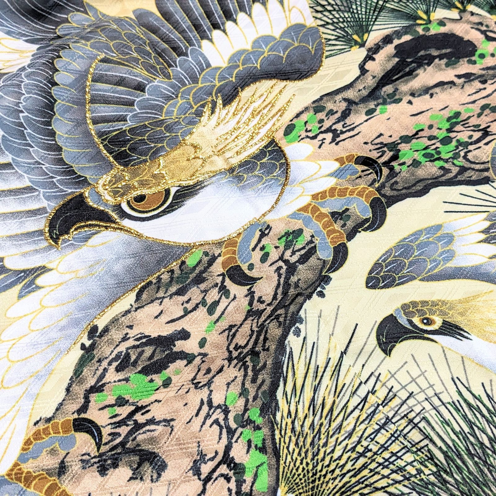綺麗な地色に金糸の施された迫力のある鷹がカッコいい羽織です。
