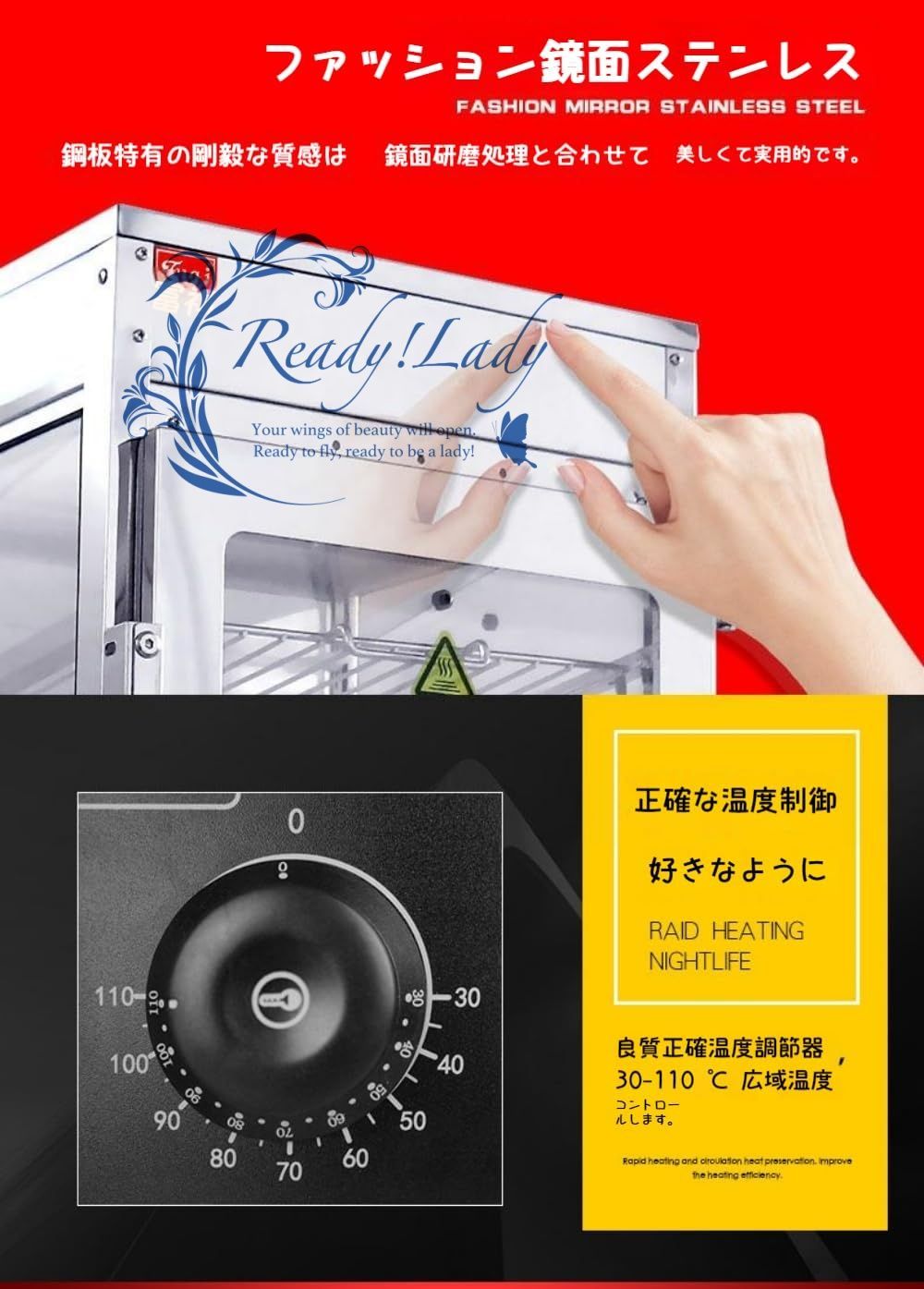 【精巧なデザイン】高温耐性の上部照明は、光の下で食べ物をより魅力的にします。特別に設計された水出口ホースは手の火傷を防ぎ、内部の湿気を効果的に排出して掃除が簡単です。