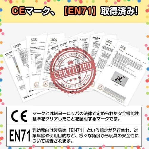 一台4役、長く楽しめる:押し棒付き三輪車-まだひとりで上手に漕げないお子様でも大丈夫。押し棒でお子様が誤ったハンドル操作をしても安心して散歩ができます。三輪車-押し棒を外して通常の三輪車として、お使いいただけます。バイク-バイクは足蹴り走行なので、乗っているうちに足腰が鍛えられ運動能力のアップが期待できます。二輪車-バランス感覚やコントロール力が身につけられ自転車に乗るための練習用最適です。