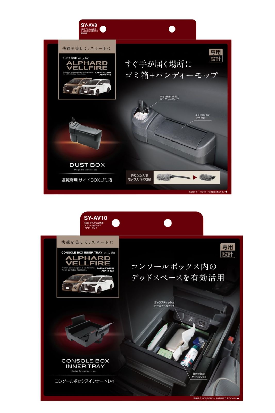 SY-AV8 40系 アルヴェル専用 サイドBOXゴミ箱プラス 運転席用 商品説明 40系アルファード・ヴェルファイア(AAHH4#/AGH4#/TAHA4#)右ハンドル車の運転席側フロントドアポケット専用のゴミ箱&折りたたみ式ハンディーモップ(専用ケース付き)です 専用設計で、運転席側フロントドアポケットにピッタリフィットします 運転席側フロントドアポケットに入れるだけの簡単取り付けです フタを押すと開き、フタを閉じて押すとロックする構造で、簡単に開閉することができます フタにはダンパーを採用し、スムーズな動きで開きます たまったゴミは本製品のゴミ箱を上下分割して捨てることができます ホコリをしっかりキャッチする極細繊維のハンディーモップを付属しています 内装に合わせた革シボ調です ゴミ箱の容量は約1.3Lです 調査日(2023年5月現在)以降のマイナーチェンジ車には適合しない場合があります 運転席側フロントドアポケットに追加オプションが装着されている車両へは取り付けできません SY-AV10 40系 アルヴェル専用 コンソールボックスインナートレイ 商品説明 40系アルファード・ヴェルファイア(AAHH4#/AGH4#/TAHA4#)右ハンドル車のコンソールボックス専用のトレイです 専用設計で、コンソールボックスにピッタリフィットします 両面テープで貼り付けてセットするだけの簡単装着です スマートフォンや財布等の小物を手軽に置けます 収納物が傷付かないクッション付きです センタートレイ裏側にボックスティッシュをベルトでセットできますボックスティッシュの取り替えはベルトを調節するだけで簡単に行なえます 内装に合わせたシボ調です 調査日(2023年5月現在)以降のマイナーチェンジ車には適合しない場合があります コンソールボックスに追加オプションが装着されている車両へは取り付けできません 収納物によっては、コンソールボックス内の電源等が使用できなくなる場合があります 本製品は下記の条件を満たすボックスティッシュに対応します 袋入りタイプのティッシュには対応しません