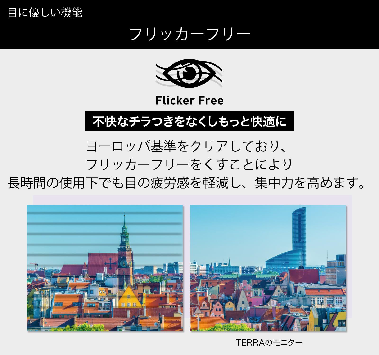 【目に優しい設計】光の反射によるギラつきがない非光沢パネル、美しい発色を維持できるハードウェアブルーライトカット、フリッカーフリー機能を搭載。目に与える負担が少ないので作業や、動画視聴、ゲームなど長時間の使用にもおすすめです。
