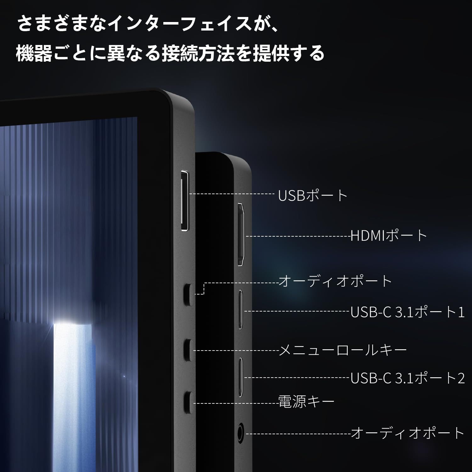 【モバイルタッチパネルモニター|幅広い機器との即時接続】モバイルモニターとしての最大の利点である「プラグアンドプレイ」を実現。USB Type-C 3.1×2、HDMI、USB 2.0ポートを備え、ゲーム機やスマートフォンを含む多種デバイスと即座に接続。モバイルタッチパネルモニターなら、出先での作業やエンタメ環境構築がワンタッチで完了します。