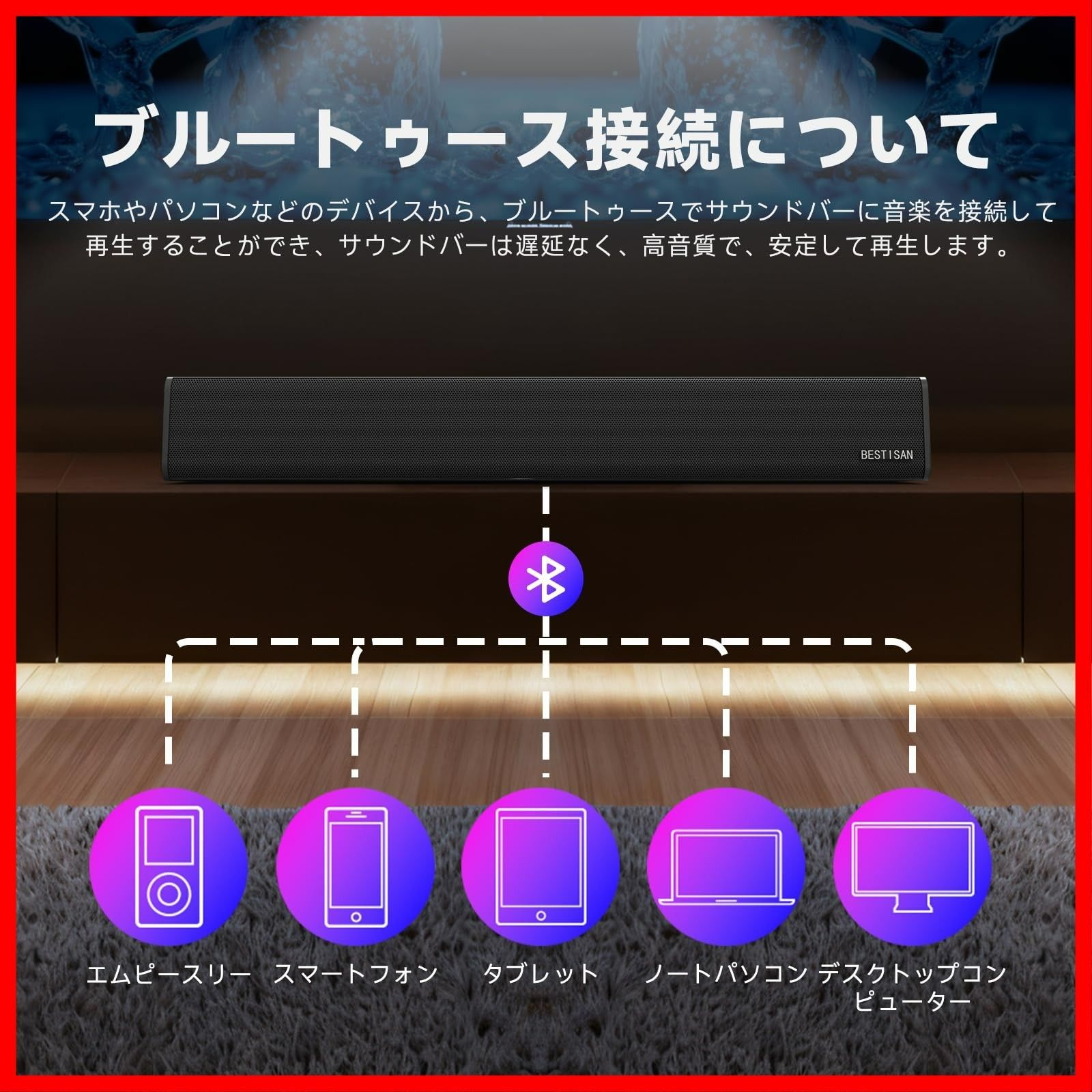 【接続方法】:サウンドバーはBluetooth、AUX、RCA、USB、デジタルオプティカル、ARC、USBなど多様な接続方法をサポートしています。デジタルオプティカルケーブル、3.5mm to 3.5mmオーディオケーブル附属します。