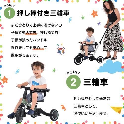 一台4役、長く楽しめる:押し棒付き三輪車-まだひとりで上手に漕げないお子様でも大丈夫。押し棒でお子様が誤ったハンドル操作をしても安心して散歩ができます。三輪車-押し棒を外して通常の三輪車として、お使いいただけます。バイク-バイクは足蹴り走行なので、乗っているうちに足腰が鍛えられ運動能力のアップが期待できます。二輪車-バランス感覚やコントロール力が身につけられ自転車に乗るための練習用最適です。
