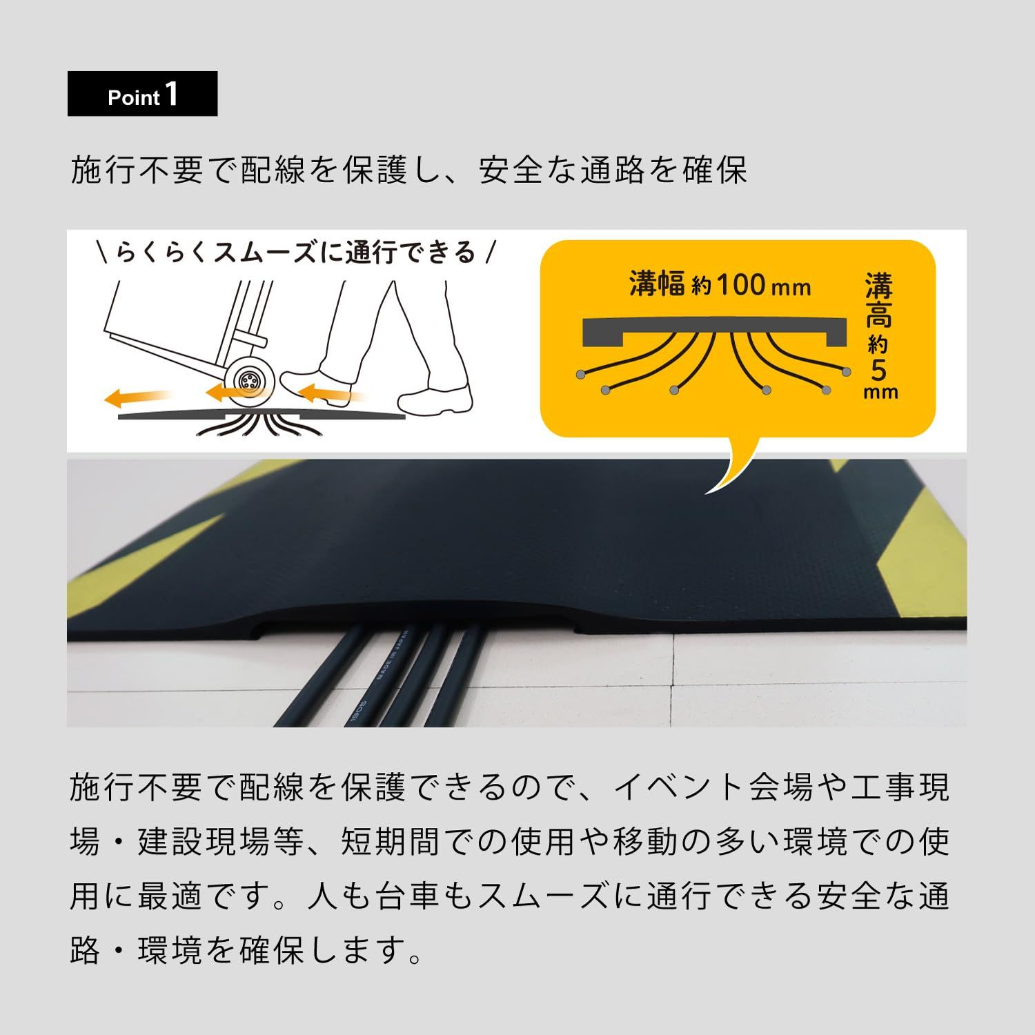 マットを置くだけでケーブルを保護することが可能。設置工事や作業は必要ありません。