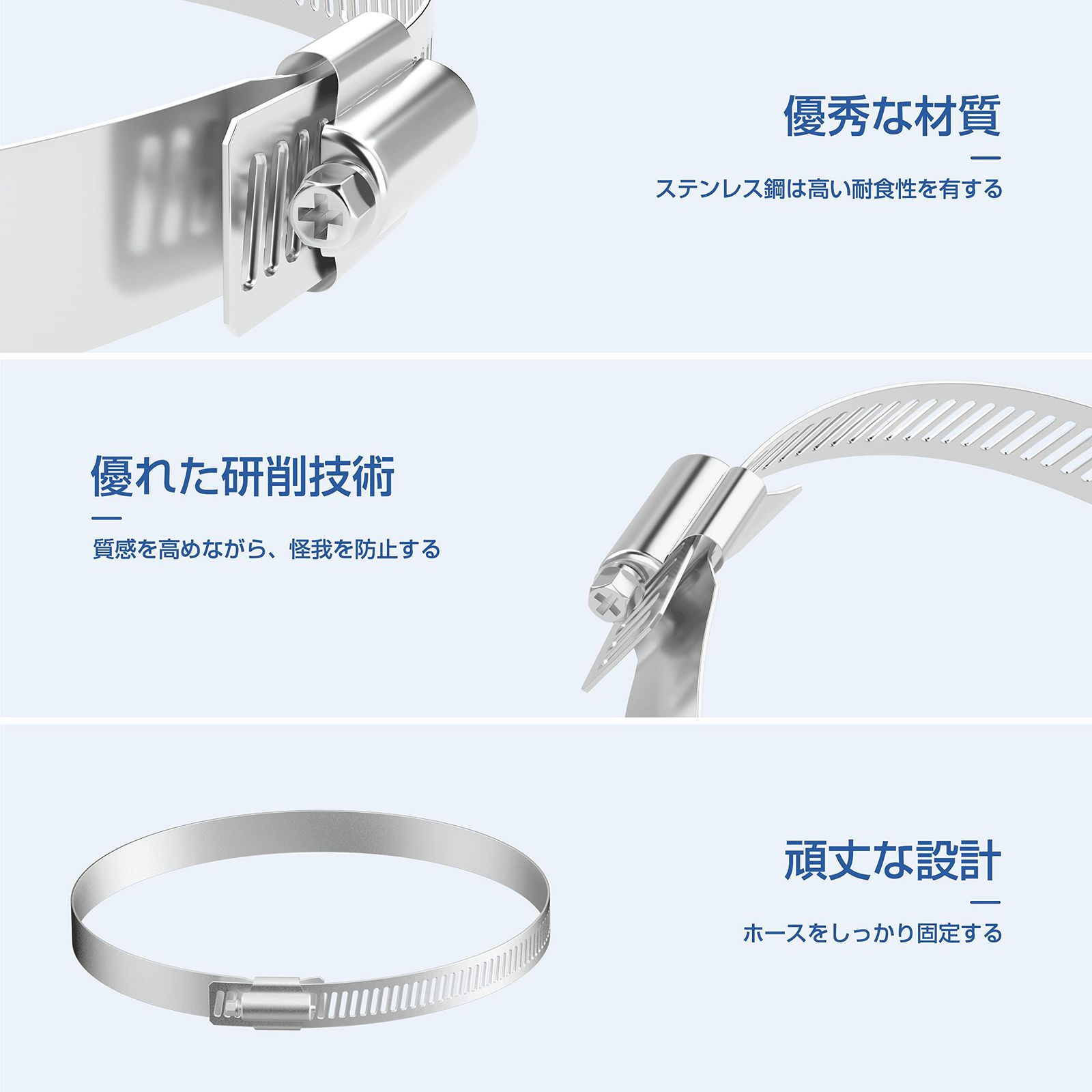 ?【優秀な材質&優れた研削技術】ステンレス鋼は、クロムを含んでいるため、錆びを防ぐことができます。ホースバンドの質感を高めながら、怪我を防止します。見た目はピカピカで綺麗です。