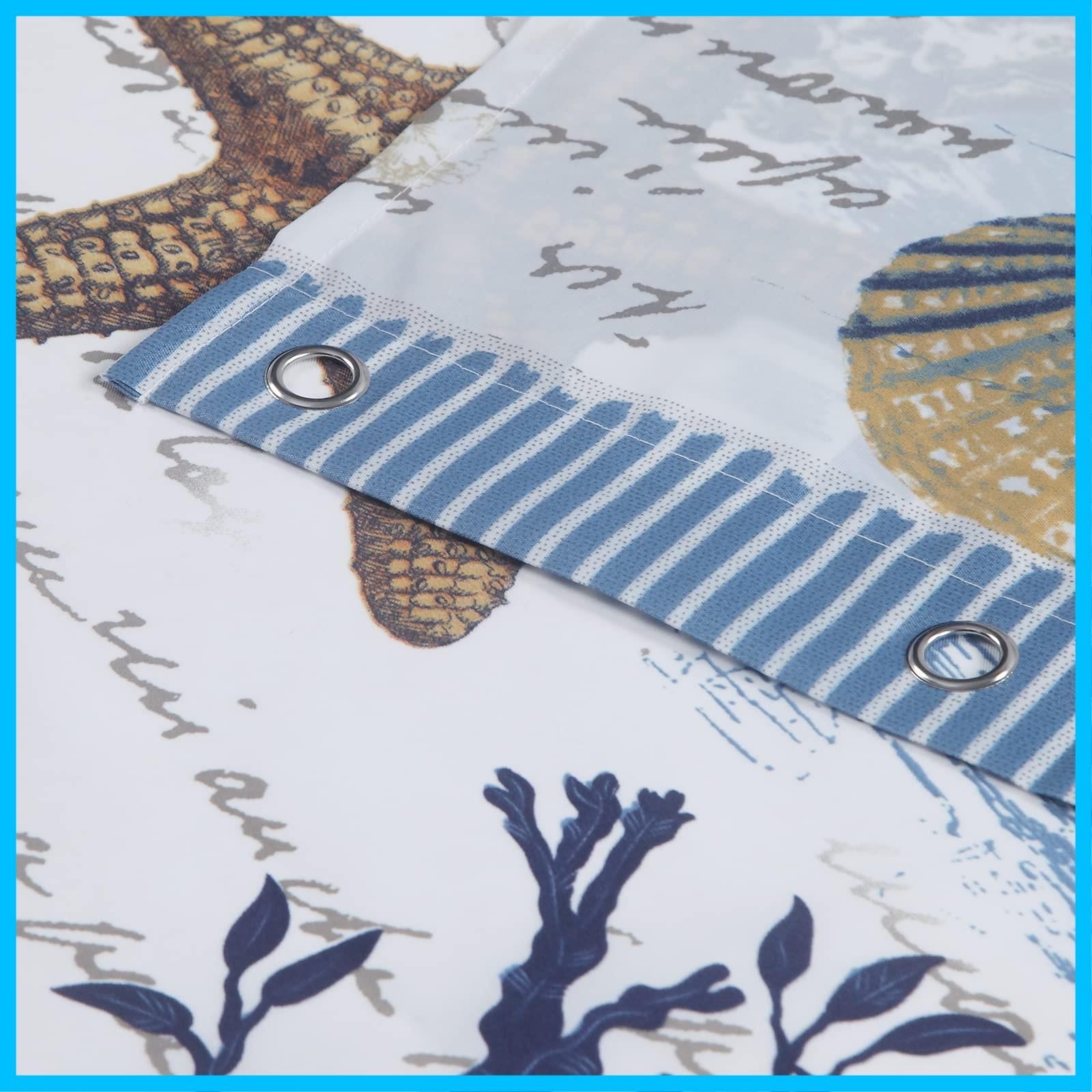 海をテーマにしたストライプの縁の入浴カーテンで、あなたの海辺のリゾートの家をれてこのシンプルなプリントはのヒトデサンゴと帆船の灯台とはがきの背景の美しい色とみ合わせることができます