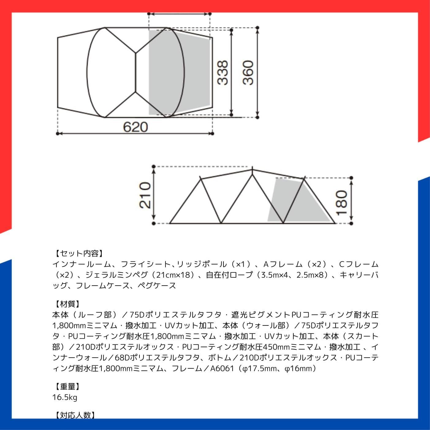 材質:本体/75Dポリエステルタフタ・遮光ピグメントPUコーティング耐水圧1,800mmミニマム・撥水加工・UVカット加工(ルーフ部)、75Dポリエステルタフタ・PUコーティング耐水圧1,800mmミニマム・撥水加工・UVカット加工(ウォール部)、210Dポリエステルオックス・PUコーティング耐水圧450mmミニマム・撥水加工(スカート部)、インナーテント/68Dポリエステルタフタ(ウォール部)、210Dポリエステルオックス・PUコーティング耐水圧1,800mmミニマム(ボトム部)、フレーム/A6061(Φ17.5mm、Φ16mm)